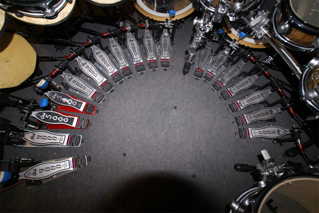 应该和terry bozzio一样,都是用联动装置的吧