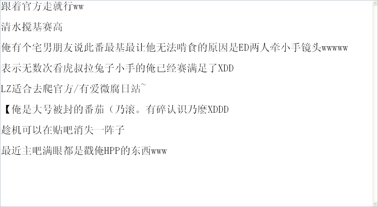 在WB上看到那个虎叔的攻略游戏条漫。先有人说“巴尼怎么越来越痴汉了”,马上就有人说“巴尼本来就是痴汉^q^”,然后又有人接上“巴尼的萌点就是痴汉和崩坏”……我去这货谁啊。那些人眼瞎了还是被洗脑了,哪只狗眼看到动画里的兔子有半点痴汉的样子?我给我妈这个不懂CP的人看了我妈都说兔子是个正经好青年。别为了让虎叔受就给兔子硬加个痴汉属性好吗?当兔子是玩具呢?OOC居然还能玩得不亦乐乎,你们这根本不叫同人,叫TMD原创。(抱歉我真的忍不住了,没地方发最后来这……)