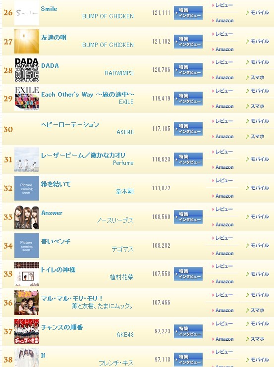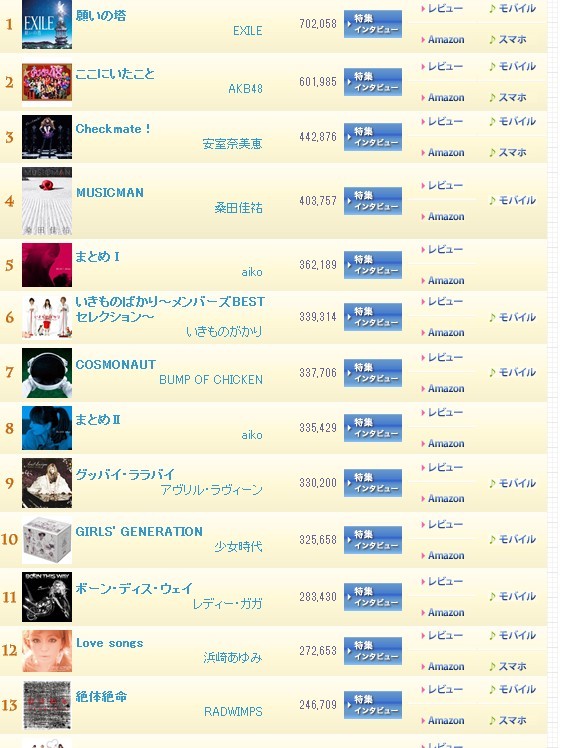oricon上半年度销量统计,鸟团专辑销量前10,单曲进入前30