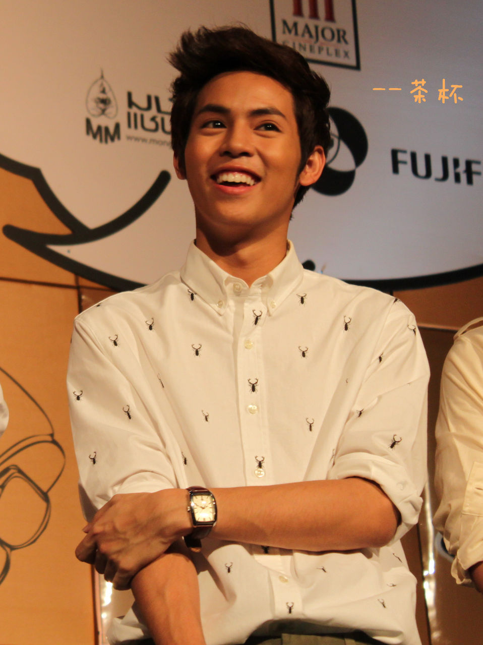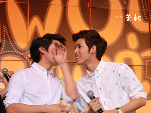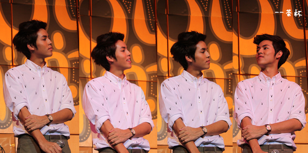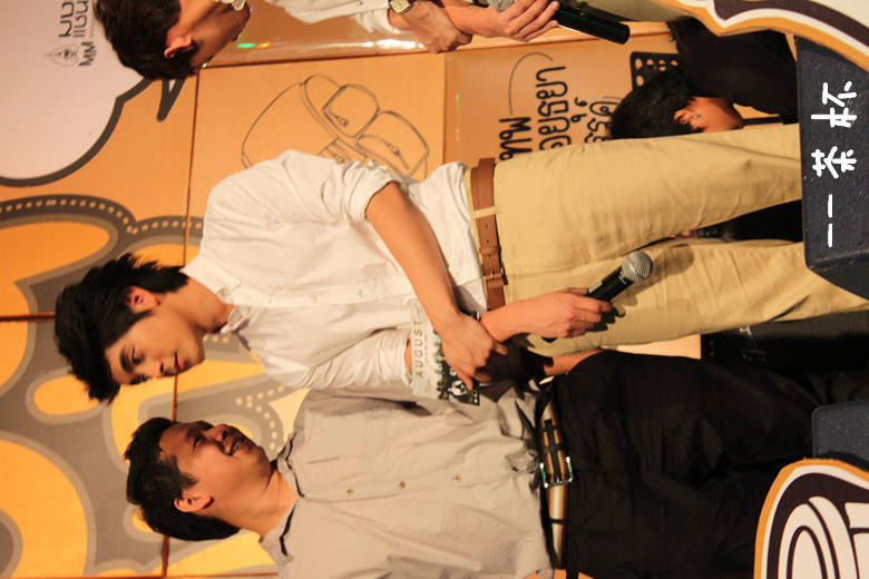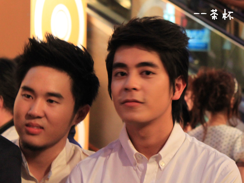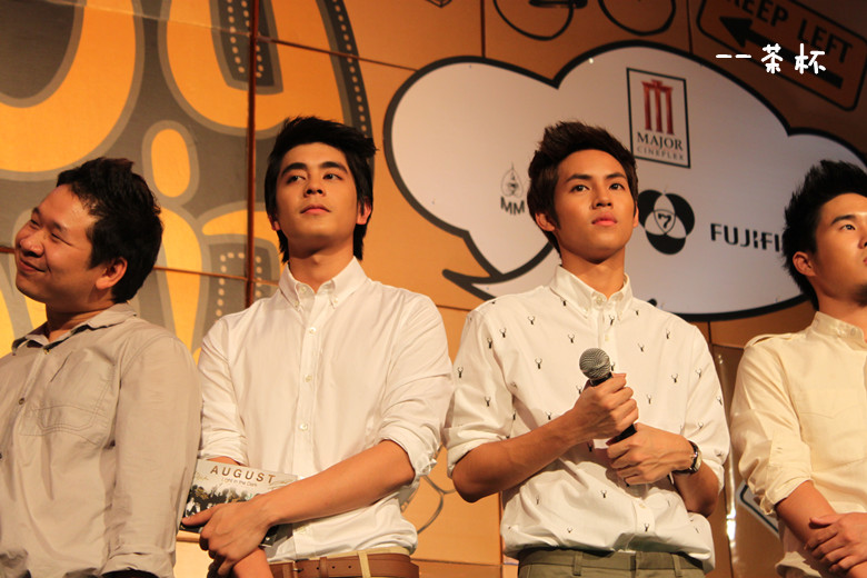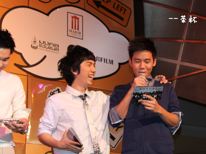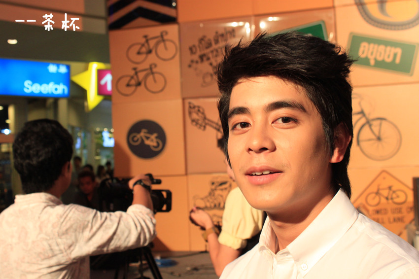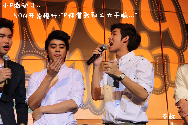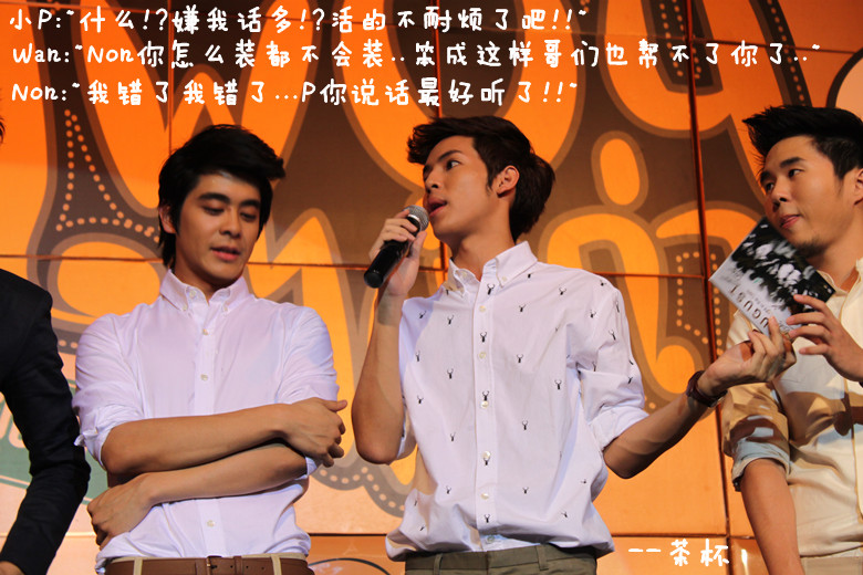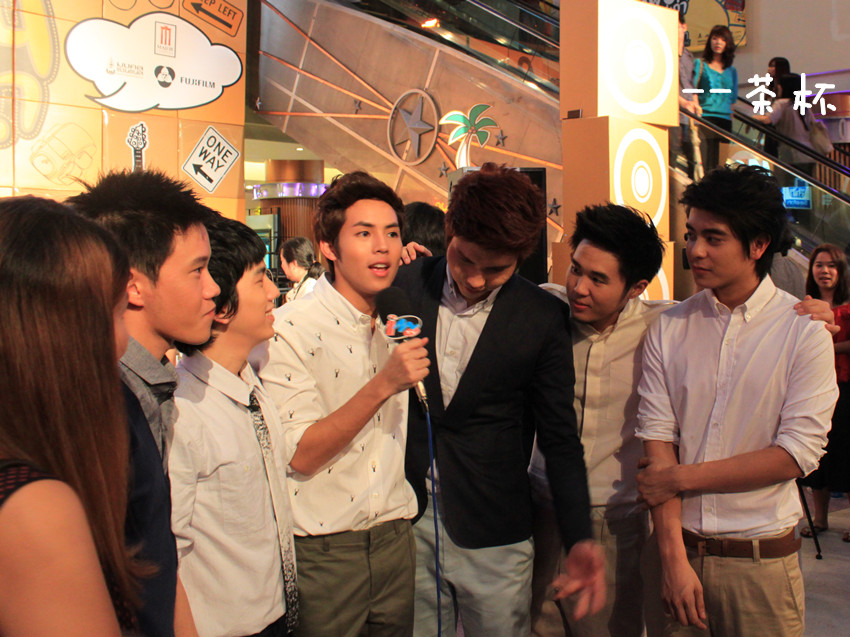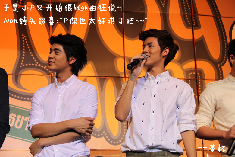 于是鼓足勇气....绕到胖子和经纪人姐姐那块(P'Mil P'Mai还有Beer都在~),跟他们打招呼,胖子很妩媚的回应~~(老丽你该心动了~~~)(再跑题..胖子真的瘦了不少啊!!!!衬衫都撑不起来了!!!但是肚子还在呃...)