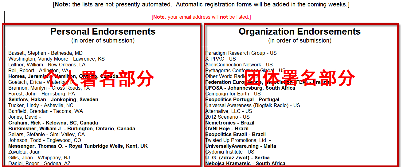 这是一个由国外UFO、2012相关的研究探索小组《典范研究小组》所发起的一项签名活动,意在引起更广泛人群对事实存在于地球上很多年的外星人的认识,顺利推动大揭露进程。