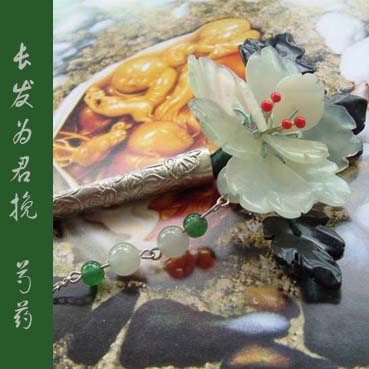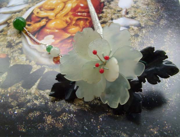 此簪由天然岫玉花瓣,墨绿叶子,东陵玉珠和苗银簪干组成