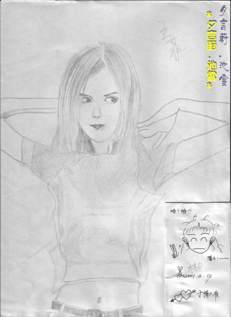 看看偶当年的信手涂鸦~素描王菲~`素描不是本人的专长,本人只擅长画日本漫画人物~~``风景和素描都不在行~~`我长这么大,只画过两个明星的素描,一个是孟庭苇,一个就是王菲~~ 因为不是学美术的~~~`画得不好,献丑了~~)![[88]](/static/emoticons/88.png)
