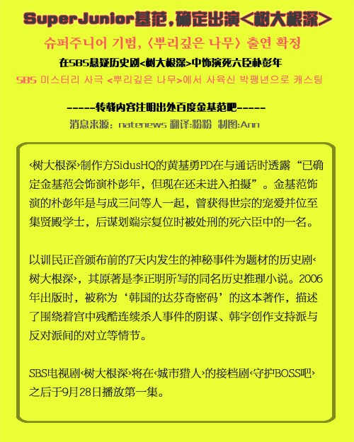 SuperJunior基范,确定出演<树大根深>在SBS悬疑历史剧<树大根深>中饰演死六臣朴彭年