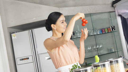 照片中,高小英的皮肤依然白皙耀眼,姿态端庄优雅,丝毫没有已经为人母的感觉。在这里,她变身自信,对任何事都可以掌控的挑剔妈妈。商品的宣传人士称:『高小英在制作料理过程中,很仔细地做了好多记录,拍摄开始后,立马变身为非常专业的演员,令工作人员赞叹不已。』