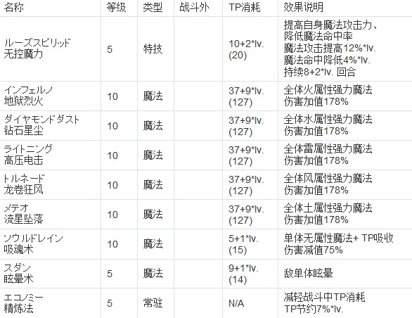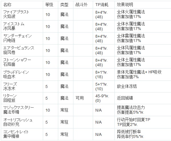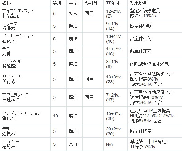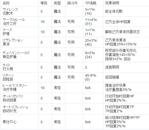 解除魔法:珍贵的buff消除技能,比黑骑那招更实用,不仅是全体效果而且不存在命中问题。后期对抗一些强敌时非常有用。注意歌唱效果不能驱散,遇到诗人类型的怪请使用沉默或气绝打断其咏唱。