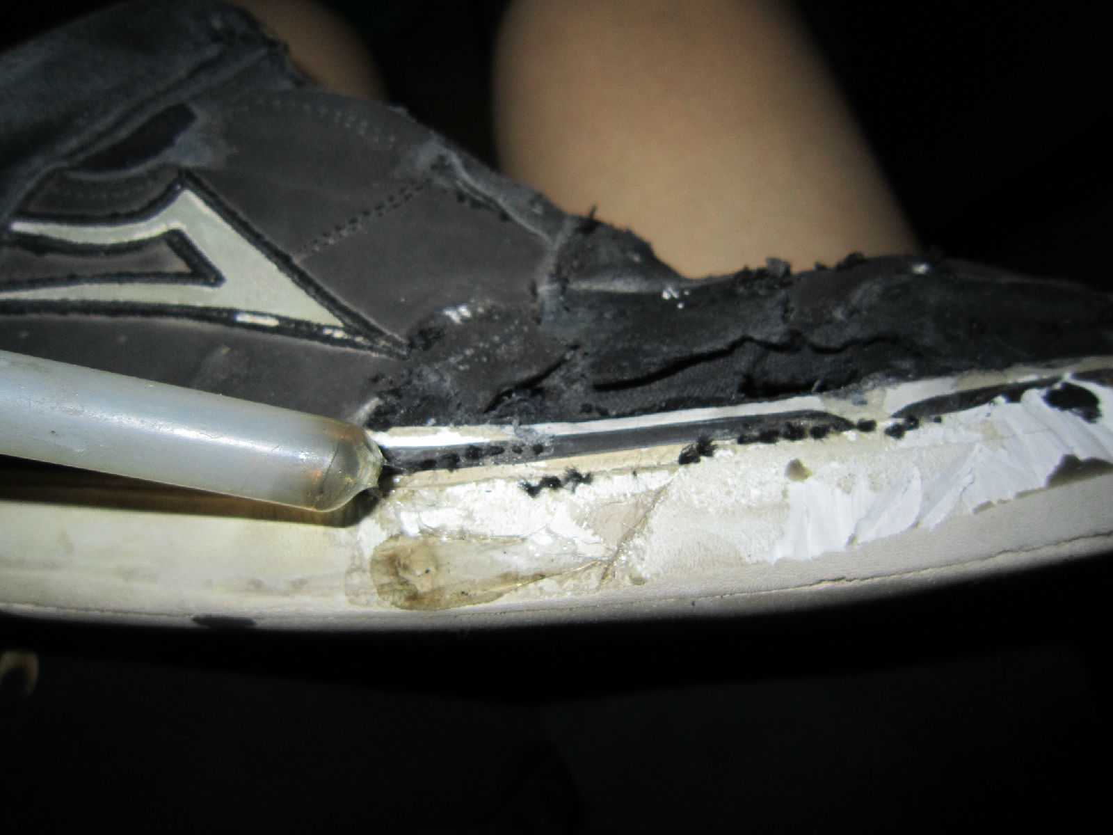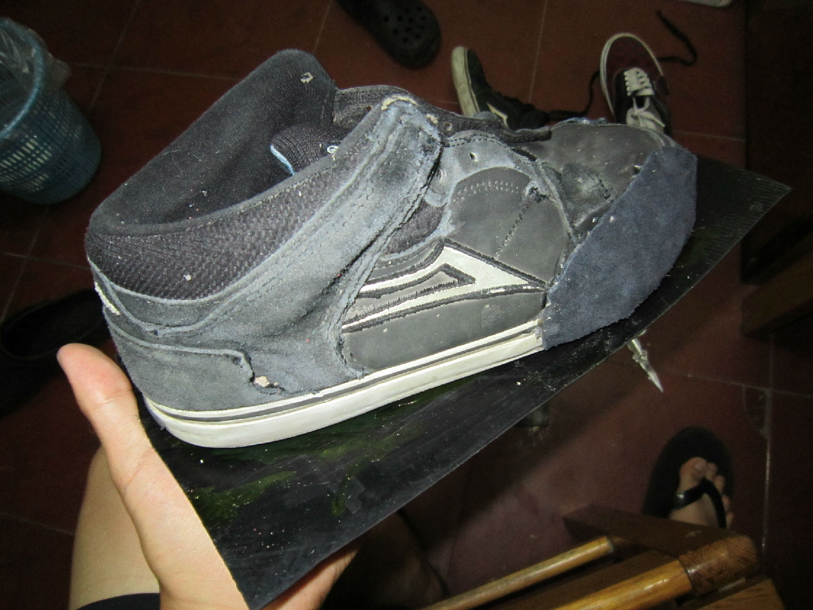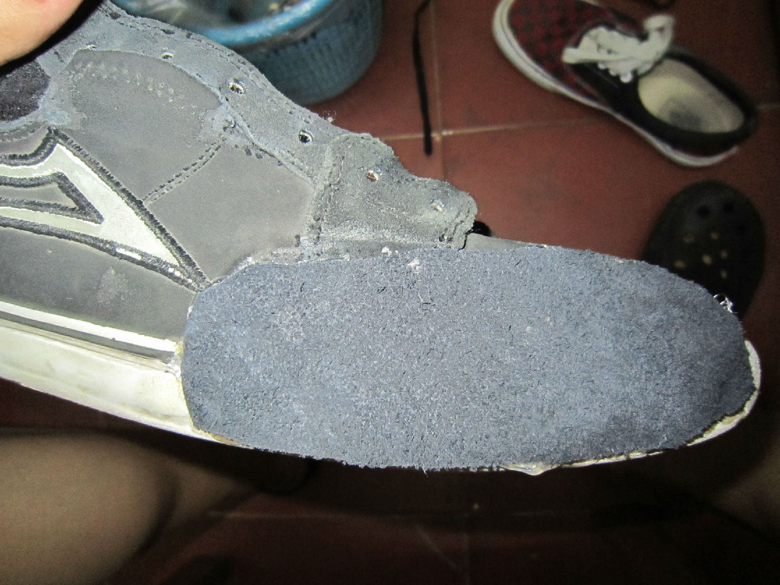 首先先来看一下我的鞋子。。。。自己看吧。。是一双lakai。连走路带滑板穿了9个月了。补过一次。就黑一块那。鞋子挺不错的。。。就是这样了。。