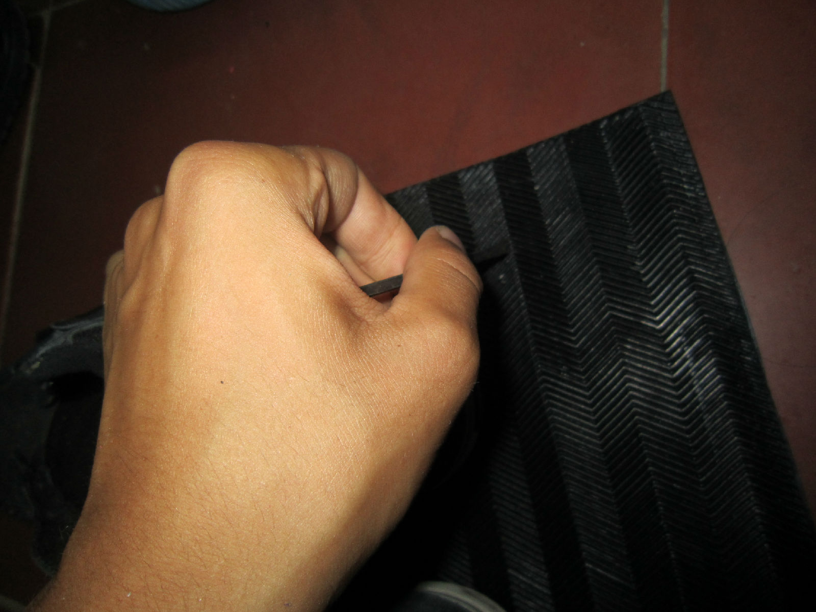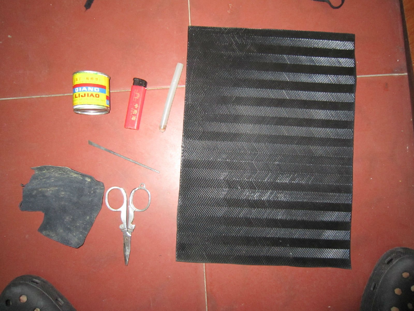 首先是准备工作。一张鞋底。5块钱。一罐强力胶。行话叫黄胶。4块钱。一块翻毛皮。店主白送的。一把剪子。家里都有。一把修脚刀。1块钱吧。我家有。一个打火机。5毛钱。一根热熔胶棒。2块钱4根。有童鞋有那个热熔枪。我觉得可有可无。打火机的功力可以达到。