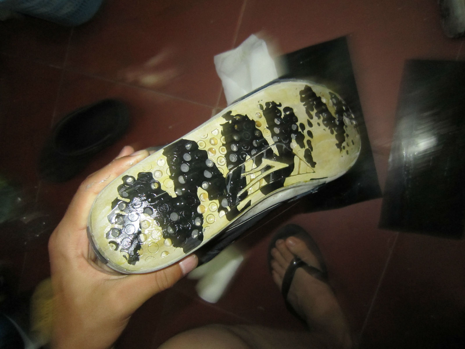 然后把鞋底和鞋底用纸沾水擦干净。