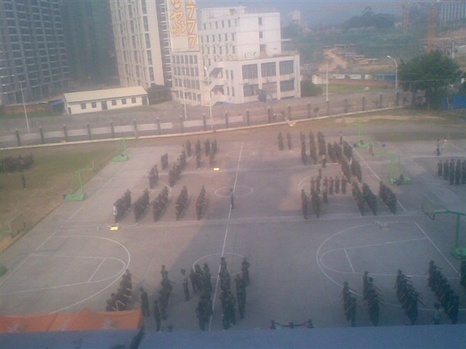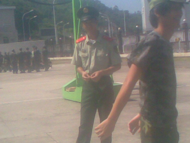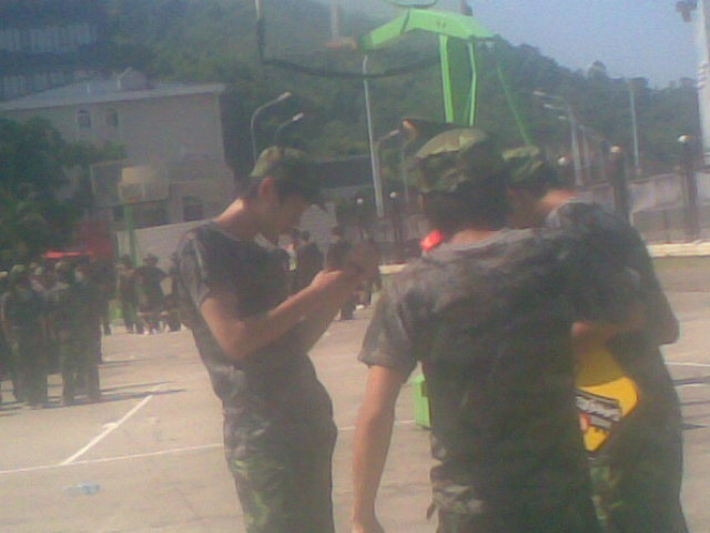 那时候 , 面对面练齐步走, 当时的营长(班长) 阿荣很萌的看着中圈被抓上去走的不好的同学。