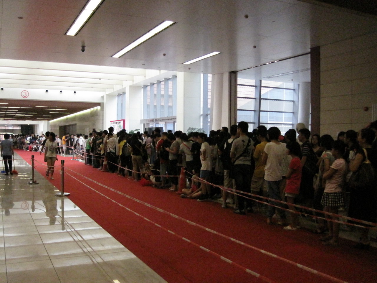 我们无论怎么看也看不出真假票的区别,只能猜两个可能:一、票的确是假的,二、票是真的,不过这种票是今天才采用,当大家都回答是昨天买的时候,就知道说谎,一定是从黄牛党手里买的,所以也要让漫迷再买票!(这里想吐槽几句:原来两个入场处都是经同一个验票口,就是说,即使没票的人排“持票”队,进去后再买票都可以,就比“购票”整整少排100米的队!