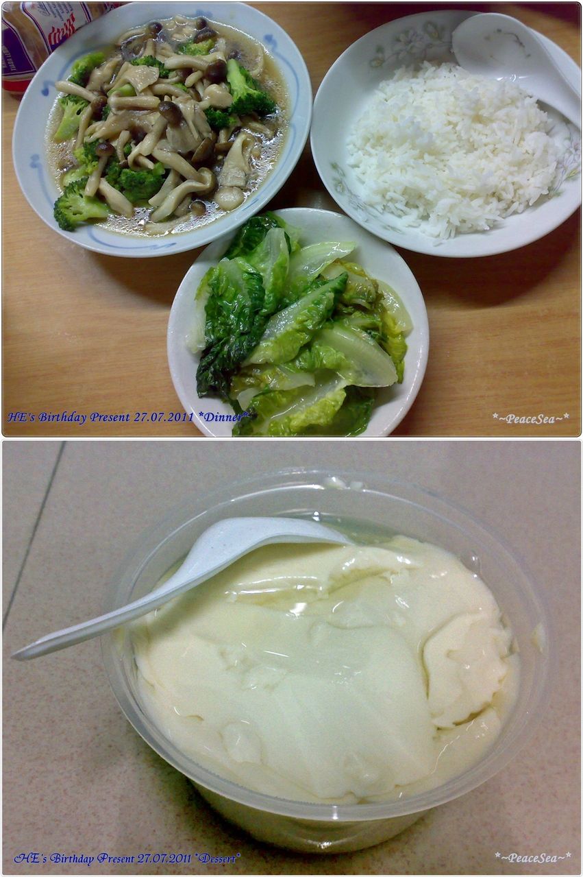晚餐:菇菇野菜花(鲍鱼菇和不知道什么菇)+油么(也不知道正确名称); 甜品:豆腐花~~我最爱的豆腐花!!