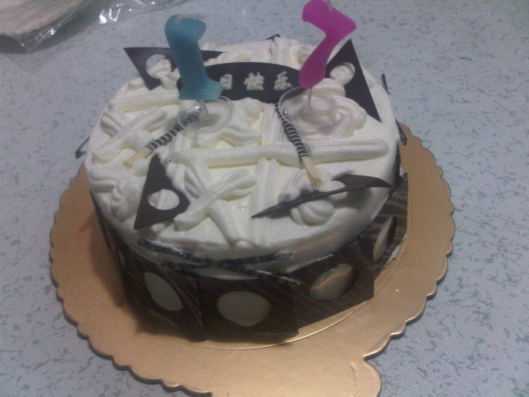 作为一个审美无能的新手 最后一步裱花时基本上无人指导的情况下 并且装饰材料匮乏 可用颜色也匮乏(拒绝色素和罐头水果)的情况下 弄成这个外观 已经可以打95分了