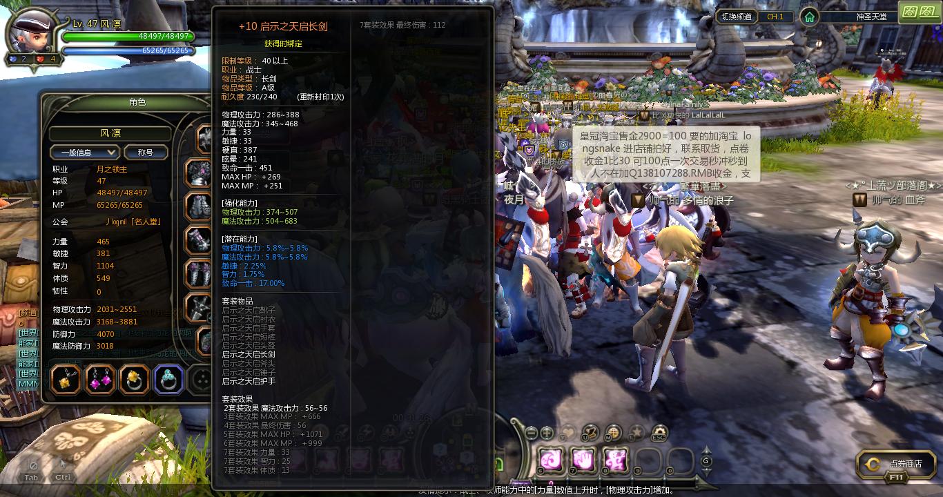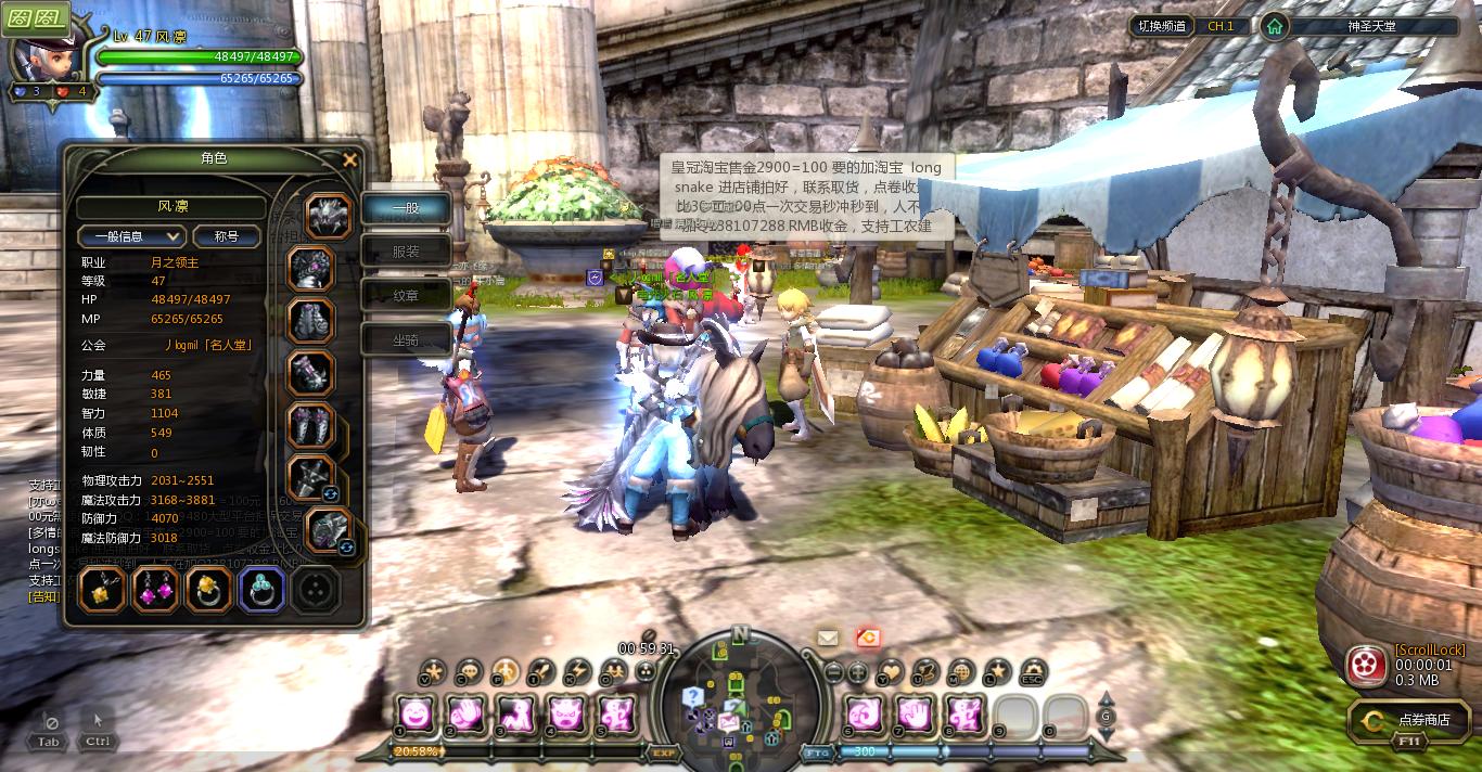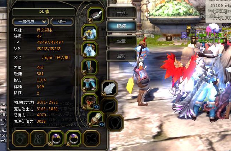现在报告最新状态:LZ终于48级了,自己筹钱换了个戒指,魔攻终于堆到了3999。。