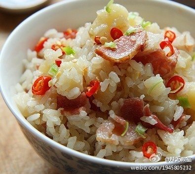 【培根土豆饭】材料:培根1包,土豆1个,蒜一个,姜少许,米饭。做法:1.培根切片,土豆去皮切小块,蒜和姜磨成蓉。2.培根炒香出油,加土豆翻炒,加少许蒜蓉,姜蓉,鸡粉,盐,胡椒,调味。3.米洗净放饭煲里,按正常蒸米饭加水。4.加炒好的土豆和培根,按下按键,蒸好后,焖10分钟。