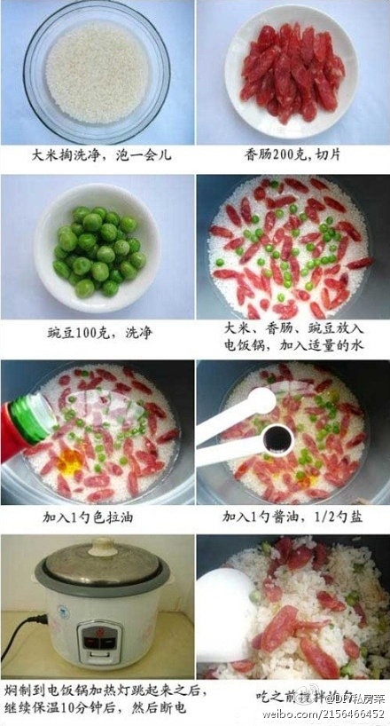 【香肠焖米饭】做法:1、大米淘净,泡一会;2、香肠200g切片;3、豌豆100g洗净;4、大米、香肠、豌豆放入电饭锅,加入适量的水;5、加入一勺色拉油;6、加入一勺酱油,1/2勺盐;7、焖至电饭锅跳灯后继续保温10分钟然后断电;8、搅拌均匀盛饭上桌。