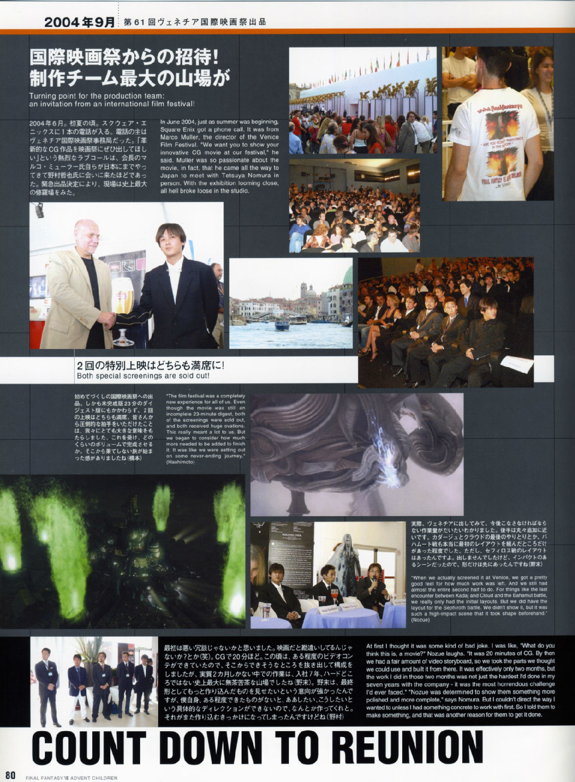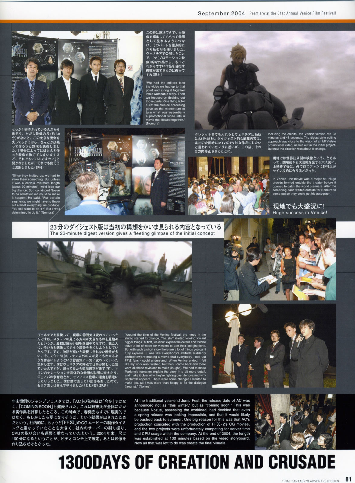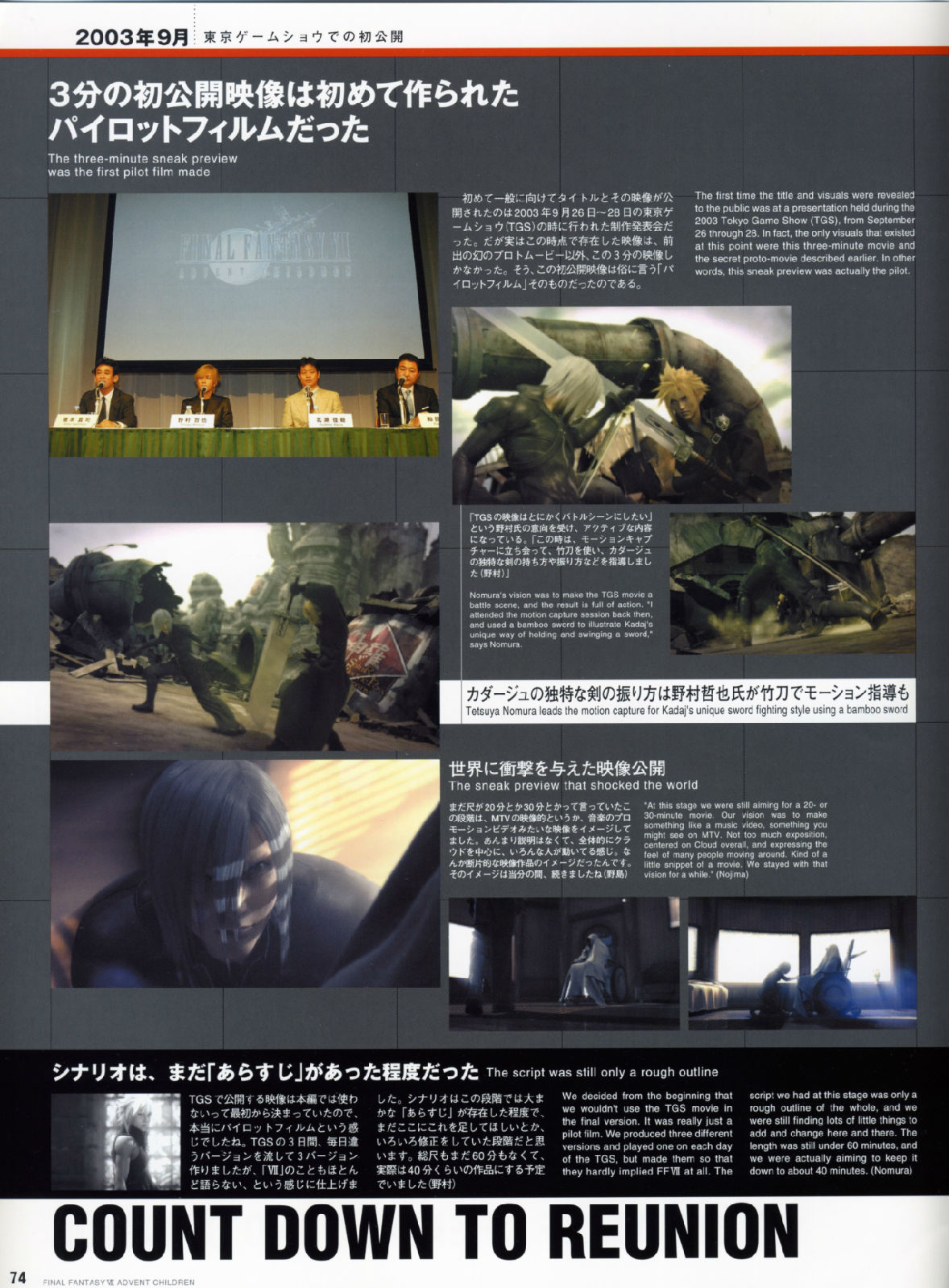 2006年4月3日在全美举办了「太空战士VII神子降临」的试映会,每一个震撼画面的播出,都可以听见观众席里倒抽一口气的赞叹,而不管是克劳德与妖艳的赛菲洛斯大对决,或者是感人的ENDING落幕,都获得了全体的起立致敬,让现场气氛沸腾到最高点,也等於直接宣布了AC的胜利果实。
