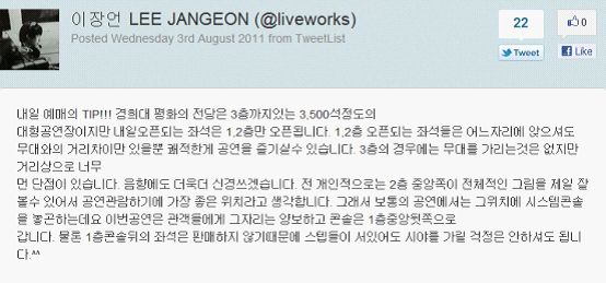明日预售的tip:庆熙大和平殿堂虽然是有三层3500个座位的大型公演场,但明天开放的座位只有1层和2层。1,2层开放的座位是不管坐在哪个位置,都能很好,很舒适的观看舞台。3层的情况是虽然没有遮挡舞台的东西,但距离实在是太远了,这是个缺点。音响也更加麻烦。我个人认为,2层的中间是整个的图片中最好的位置,我想也是最适合观看公演的位置。所以一般公演中,那个位置是设置为系统控制台的。这次公演是为了观众们做出了让步,将控制台放到了1层中央后面的位置。当然,1层控制后面的座位不会去出售,工作人员即使站着,也不用担心视线问题。