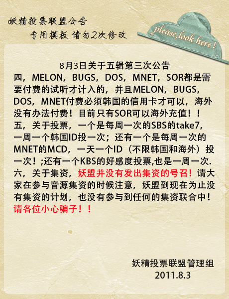 以上是妖盟对于这次五辑音源的公告的一部分,就像图里说的“MELON,BUGS,DOS,MNET,SOR都是要付费才计入的,并且MELON,BUGS,DOS,MNET必须是韩国信用卡才可以”所以,目前很多家人在做的,包括前一阵子我自己做的都是无用功!!目前,只有SBS的一分钟免费试听才可以计入,所以,大家如果可以请将精力转向这个吧!!而对于注册或者试听实在感觉很困难的各位,请抽空多多搜索吧~毕竟搜索量什么的也还是很重要的!