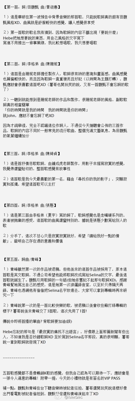 『To Hebe』五首歌的详细介绍……另外、馥甄6号上《百万大歌星》