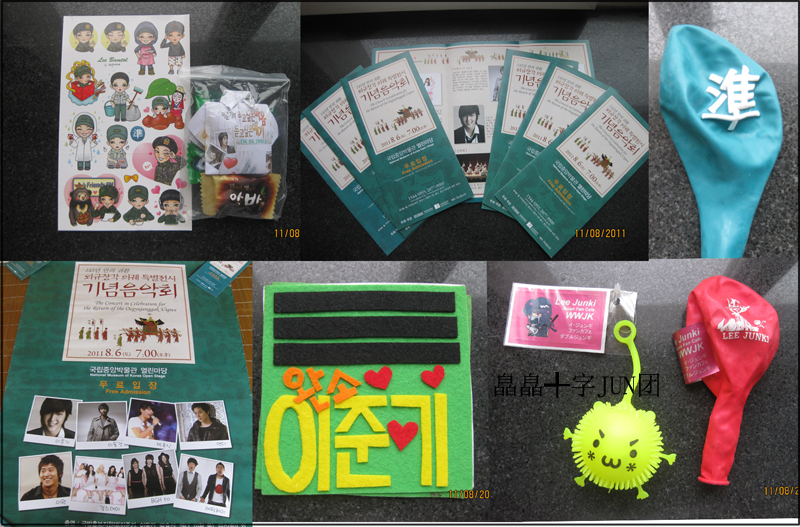 坐在我们后面的就是DC的头,她的大包里面有着无数的好东西,我们几个一看见周边就厚着脸皮蹭上去了,所以收获了不少应援物品,O(∩_∩)O~,都是很用心做的呢。有DIY的李准基上兵的臂章;有用倾心图像叠的小衣服,还顺便放了几块糖,想的真周到呢,怕大家太辛苦用来补充体力的嘛;有少年世界图像做的贴纸;有准字气球;还有日饭送的一枝梅的东西;kk送的照片;期间还去工作人员那拿了一些音乐剧的宣传册,就在我叫着马甲再去要几张回来送给中饭的时候,居然发现他们在发大海报,我脸皮厚厚的问May I have two?人家说ONLY ONE,而且工作人员很好呢,总是先照顾海外饭,等我回去告诉旁边的韩饭的时候,都已经没有了。总之,周边大丰收呢, 下次一定 不会空着手再去了,多不好意思啊。