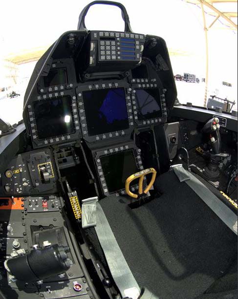那不是F22的,是f16的,世界上,摇杆在侧边的飞机就3种,1是海鹞,2是F16,三是F35,很明显不是F35的,应为F35座舱里有一个很大的多功能显示器,而且没有HUD。海鹞座舱有很大一部分是机械仪表。玩过F16战隼的就能看出,第一幅图和F16游戏里边的座舱极为相似。