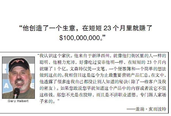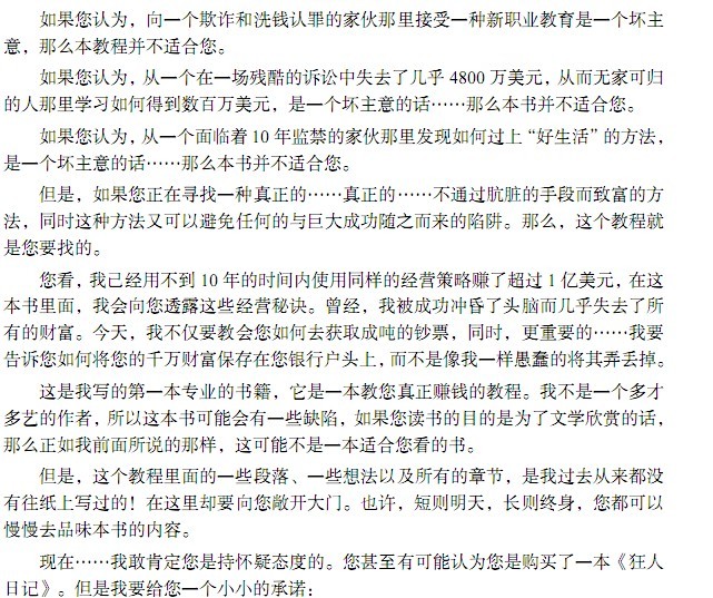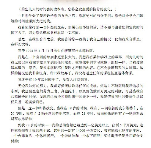 这本作者整整写了 5 年,最后终于完成了它。作者说可以与您打赌,如果现在您手里拿的这本书不仅仅是一捆纸、墨水、胶,而是一幅蓝图,一种在今日美国致富的新模式。