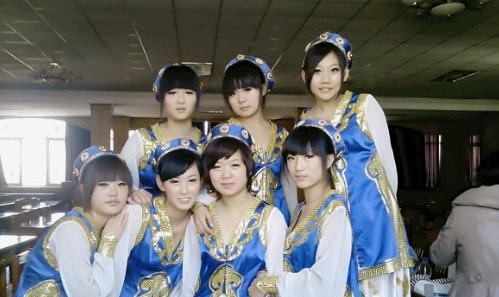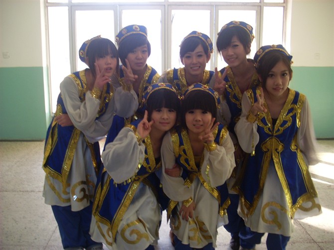 所谓的初中没学好。以为能考上高中。后来只能上个3+2。中专+大专。好在第二年的时候认识了一帮疯娘们儿。天天课都可以不上课在食堂蹲点。早晨七点五十出宿舍。买饭磨蹭磨蹭八点半才会在班里粗线。一周语文数学英语各只有一节。其他都是专业课。所以还是很轻松地。啊。跑题了。钢琴。舞蹈。声乐。每学期期末都会技能考核。上图就是。舞蹈都是自己创编的。= =。我傲娇了。其实就是我编的。三科中学得最好的就是舞蹈。那一年跳的是蒙古舞。这个舞蹈纠结了我好几周。在还有不到一周就考试的时候。我说。咱跳有现代风的内种蒙古舞吧。好吧。两天就编出来了。衣服是三十一天借的。不过一共有三个组合用这个衣服。所以一人花了十块钱吧。