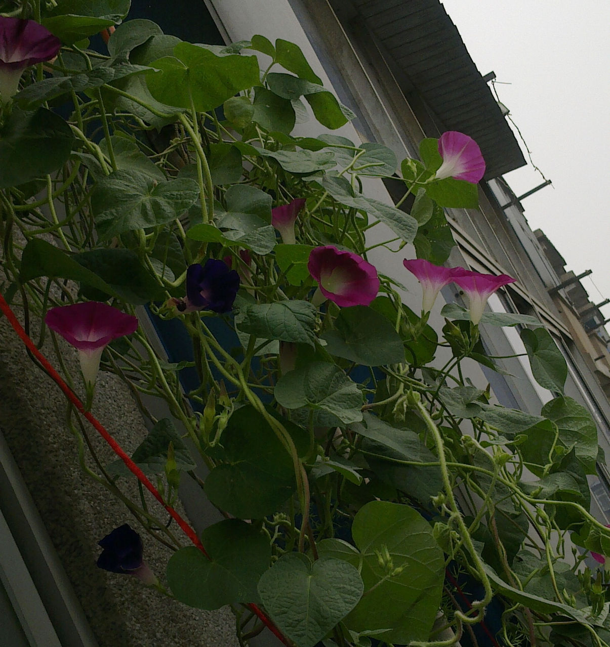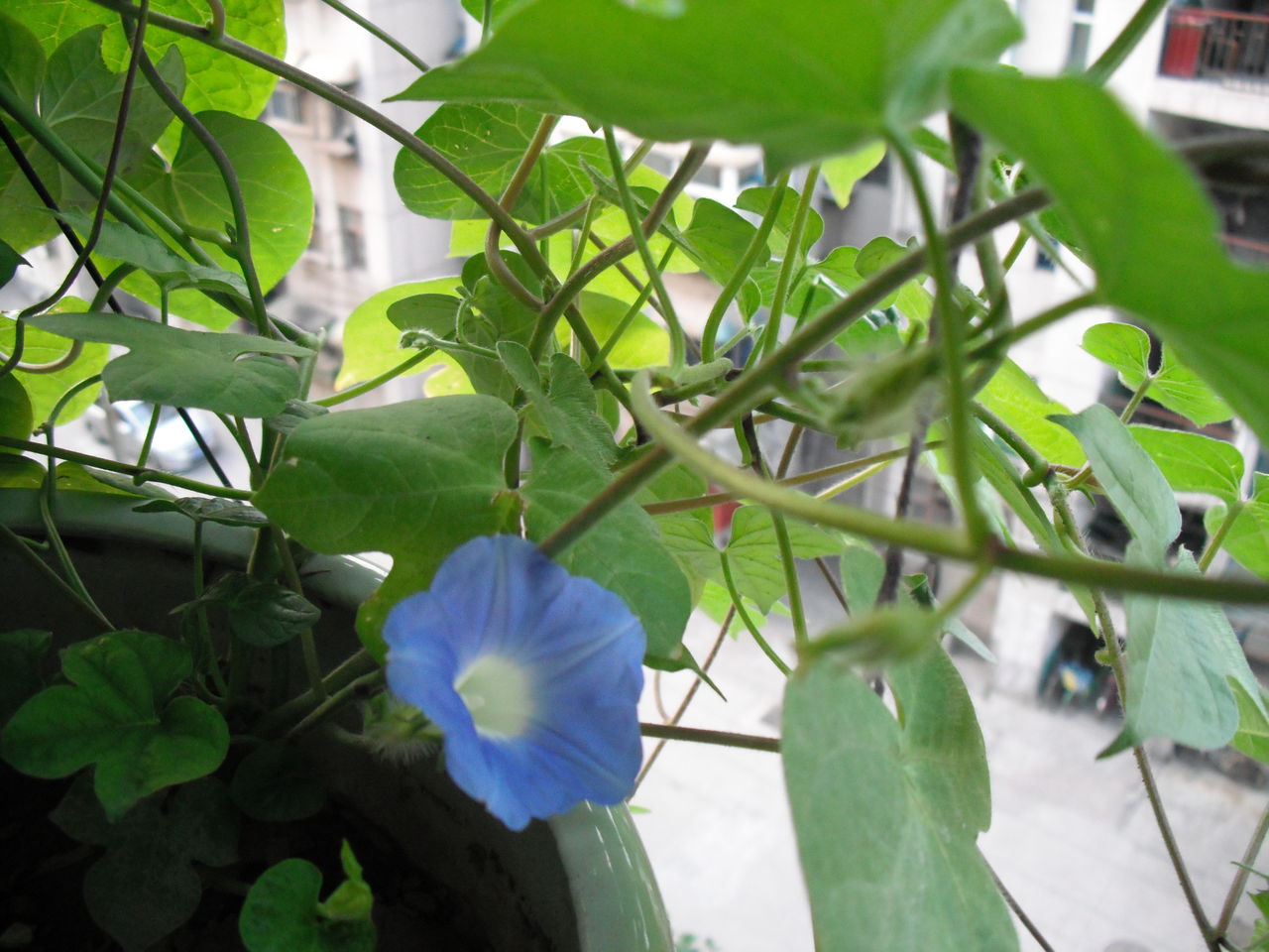 然后这个最先开的第一个颜色,蓝色的裂叶牵牛,枝叶发达,花比较小,颜色低调。。。不显眼。 开第一朵的时候我那叫一个狂喜呀~~~~