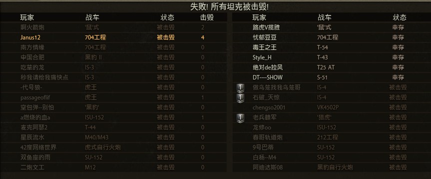 昨天打的 己方5个火炮 前三是我跟另外两个-4 其他全是中坦 看著想泪奔啊……因为对面全是重坦+4个704 结果我们还赢了…… 我重创两个704击杀一个 之后英勇献身……704全部被点亮点杀