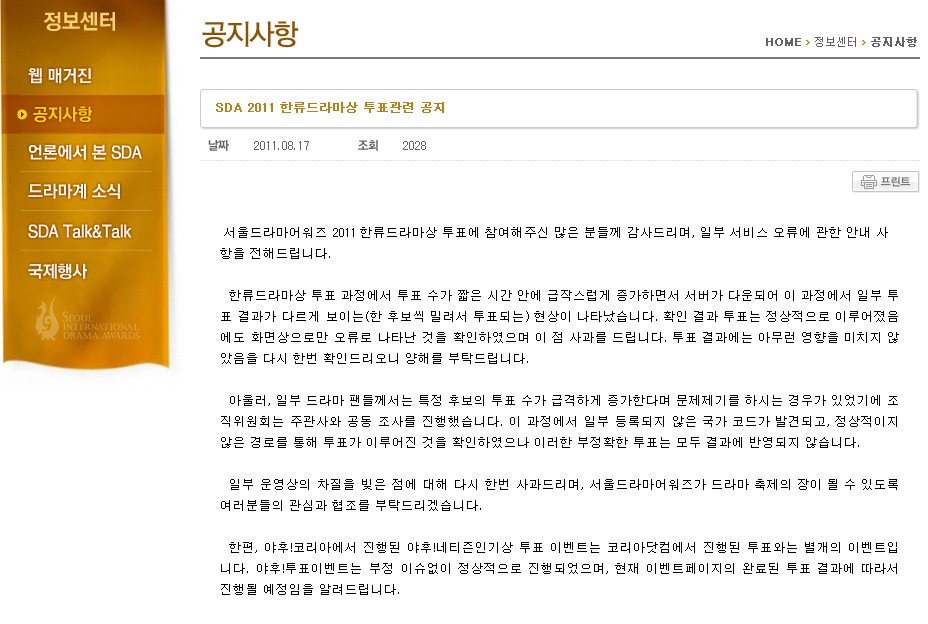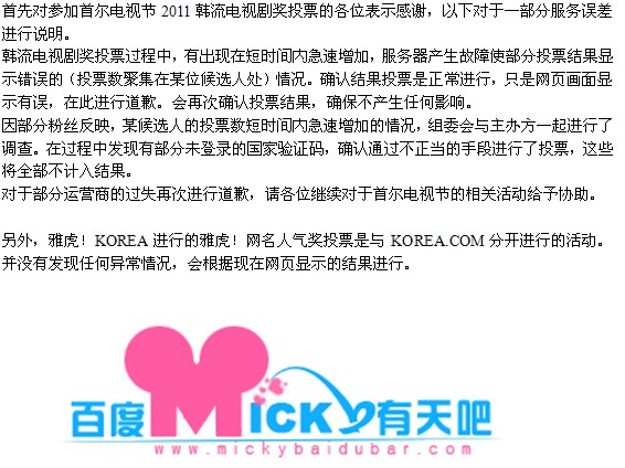 首先对参加首尔电视节2011韩流电视剧奖投票的各位表示感谢,以下对于一部分服务误差进行说明。 韩流电视剧奖投票过程中,有出现在短时间内急速增加,服务器产生故障使部分投票结果显示错误的(投票数聚集在某位候选人处)情况。确认结果投票是正常进行,只是网页画面显示有误,在此进行道歉。会再次确认投票结果,确保不产生任何影响。 因部分粉丝反应,某候选人的投票数短时间内急速增加的情况,组委会与主办方一起进行了调查。在过程中发现有部分未登录的国家验证码,确认通过不正当的手段进行了投票,这些票数将全部不计入结果。 对于部分运营商的过失再次进行道歉,情各位继续对于首尔电影节的相关活动给予协助。 另外,雅虎!korea进行的雅虎!网名人气奖投票是与korea。com分开进行的活动。并没有发现任何异常情况,会根据现在网页显示的结果进行。