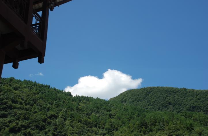 2、檐角、蓝天、绿树、行走的白云,相映成趣。