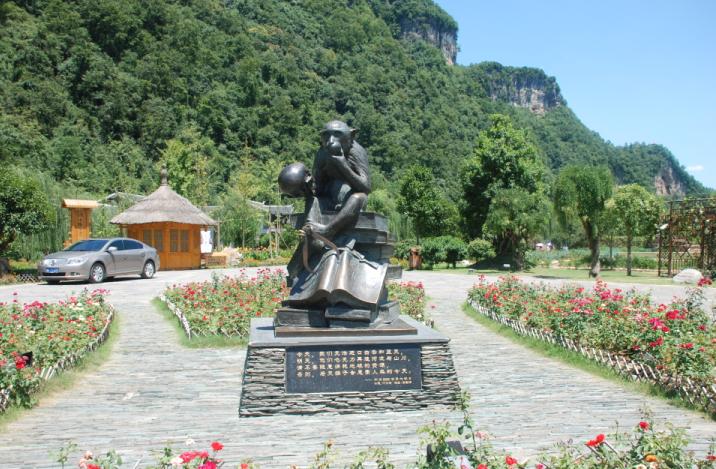 8、黄龙洞外有名的后天雕像。这只远古时代的猴子手里拿着的可是我们祖先的头骨,它在思索。思索着曾经,思索着未来。