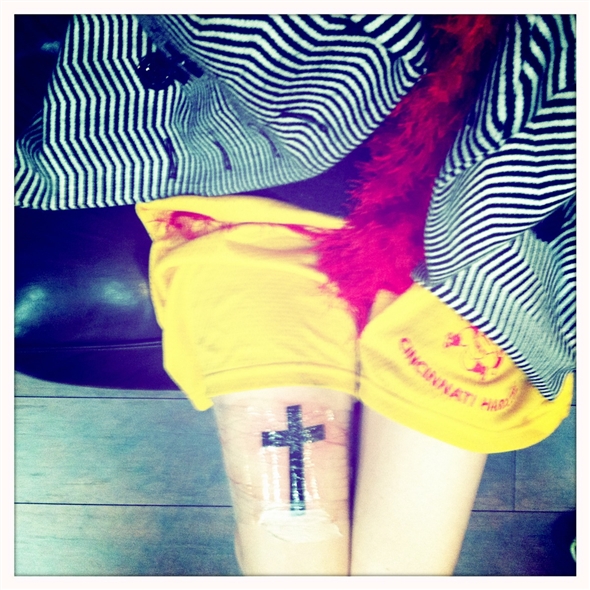 “My <3 for warped tour. (minus all the horrific bands on this year). 2 years ago in Cleveland we almost died in the storm on Warped!!! and our fans stuck around and waited for us for at least an hour. We went on anyways and played one of the most fun sets of the whole tour. So memorable. Then this year, we got to surprise Warped in Cleveland. The weather was perfect. I wanted something to remind me of some of my best warped memories. No more "tour/bro" tats for me after that one!" [source]about the cross tattoo: