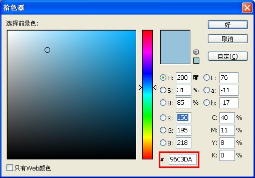 单击前景色,将前景色数值改为#96C3DA,如图