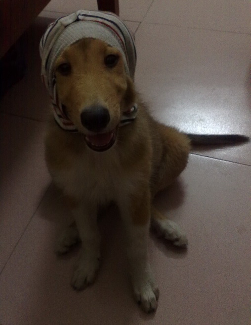 他平时喜欢玩的头巾,,戴上它,好看吗?哈哈,应该是好牛吧