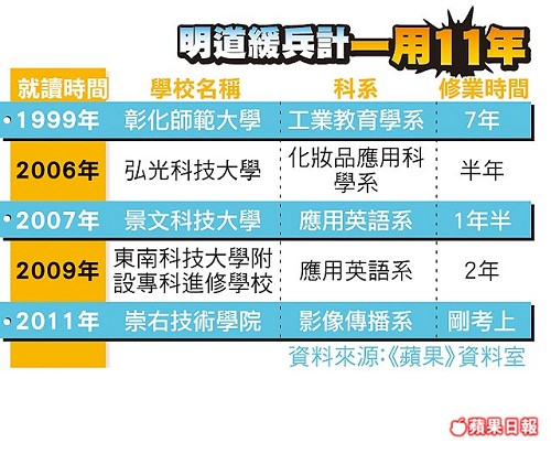 中天新闻》艺人明道大学读了11年且换4所学校,疑似转学闪兵役惹争议,7日崇右影视传播系开学明道又请假,校方表示,明道已事先和系上联络,加退选、抵免学分这周内将办完,下周将正式上课。