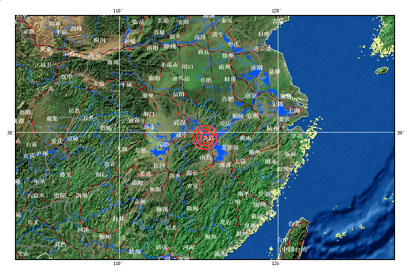 据中国地震台网测定,北京时间2011年9月10日23时20分在江西省九江市瑞昌市、湖北省黄石市阳新县交界地区(北纬29.7,东经115.4)发生4.6级地震, 震源深度17公里。