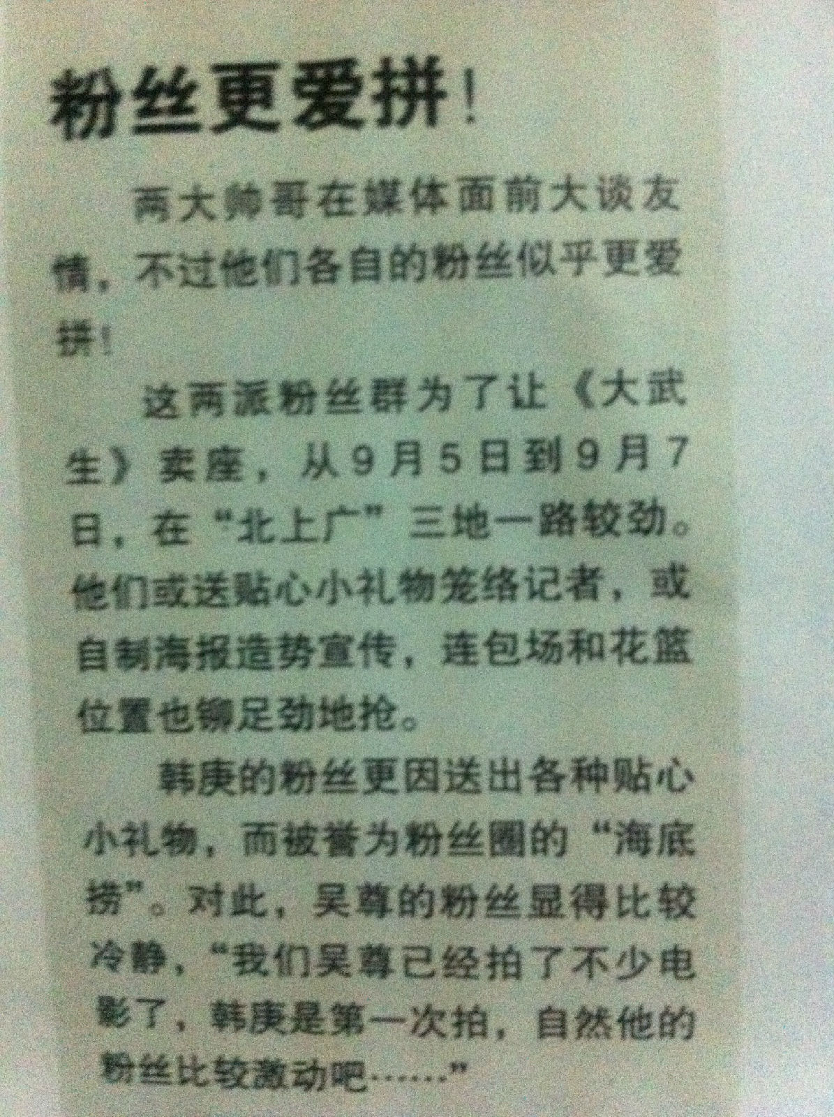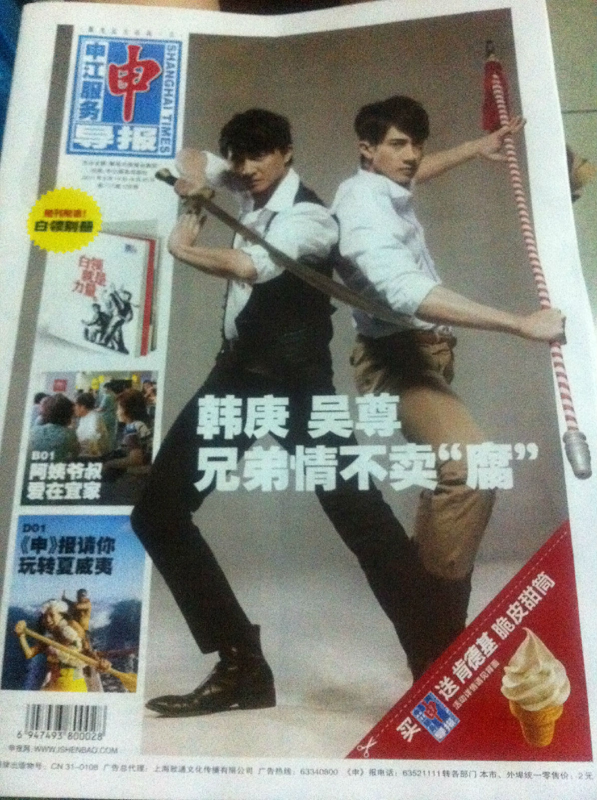 前天路过书报亭。看到然后果断的买回家。。。麻麻说你买报纸肯定是为了吴尊= =我麻麻真了解我= =然后我就看了那部分,报纸就废了。。。。