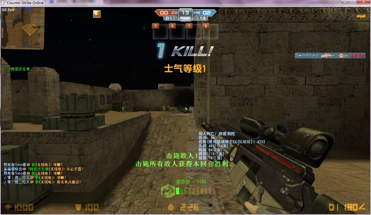 前天用裂魂 也在这个图 不过是警出生地那个角落的墙上 打死6个JS爆头四个!求超越