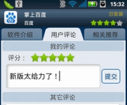 2、并在安卓市场、机锋市场、android market、安智市场、掌上应用汇、N多市场给掌上百度评分。