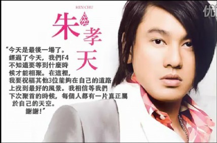 孝天:今天是最后一场,经过了今天,F4不知道要等到什麼时候才能相聚。 在这里我要祝福其他3位,能够在自己的道路上找到最好的风景。 我相信等下次聚首,每个人都会有一片属於自己的天空