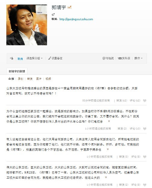 【志同刚和】【消息】不按合同延播《将军》 导演郭靖宇炮轰山东卫视
