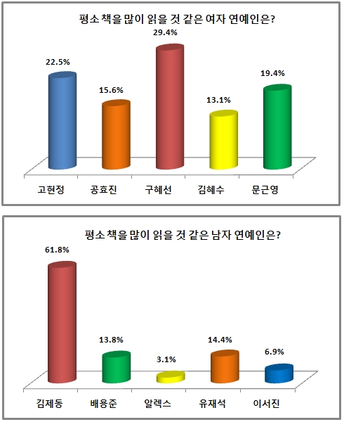 “平时多读书一样,以“男艺人金济东超过一半的61.8%(653名),名列第一,刘在锡14.4%(152名)、裴勇俊13.8%(145名)以微弱的差异,紧随其后。此外,李瑞镇为6.9%(73名)、亚历克斯·3.1%(33名)。