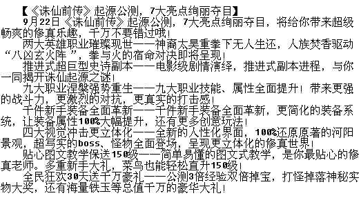 《诛仙前传》9月22日起源公测——玄幻网游巅峰巨制《诛仙前传》9月22日起源公测,在诛仙原著中原有五大门派的基础上,增加了人族和神裔两大种族概念,目前共推出11大职业,还推出了两大独创玩法和十大全新系统,修真世界的玄幻色彩全面升级。《诛仙前传》不仅引入了上古人神大战,还有诸多玩家自创剧情系统、多线分支剧情、时空战场等新鲜创意的玩法,让玩家体验到更丰富多彩的游戏乐趣。