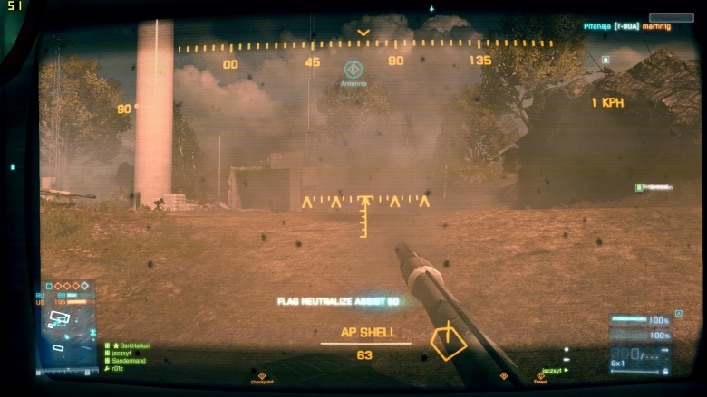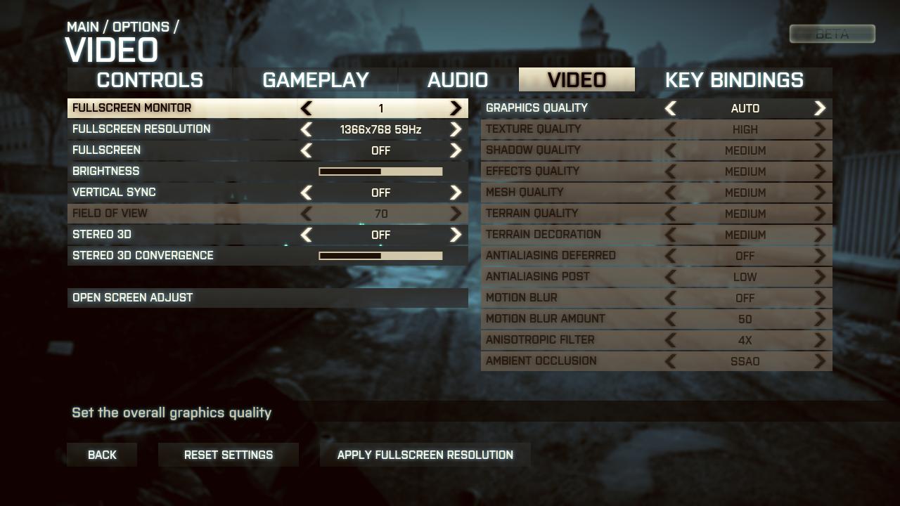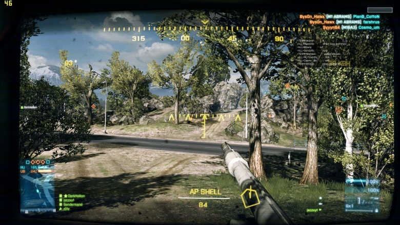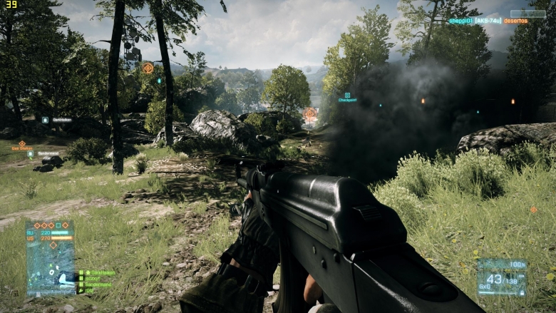 关闭AA.HABO,材质中其他HIGH,在野外帧数42~60大部分时间42帧,最低37帧 同样的帧数比在BC2里要流畅些。室内帧数60左右,比较流畅了。可能是因为动态模糊,没开AA也感觉不到明显的锯齿了。