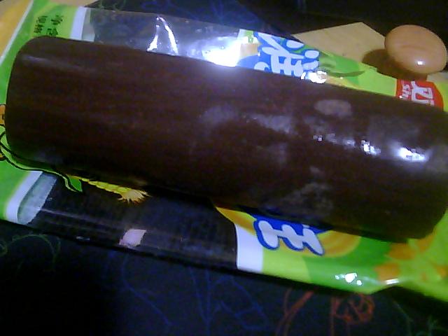 水磨成圆柱状,通体光滑,有逼真的木纹,看上去像段红色的木头。