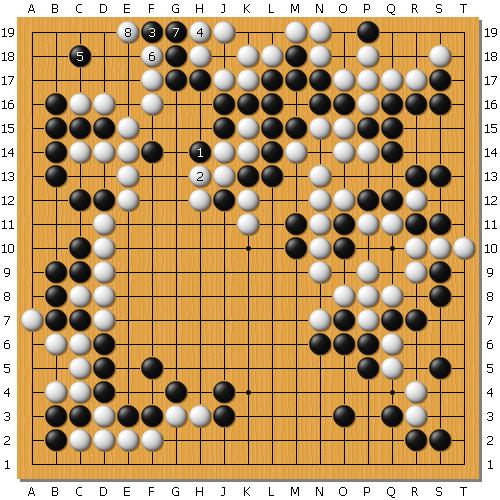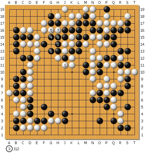 说到这题稍微聊一下。5月份的时候,手痒凑满了30盘去报名了东洋证券杯。当然果不其然一轮游了,这盘就是那局棋。我执黑,中盘打入右边没想到对手轻易送了一块,然后猛攻我上面。黑棋岌岌可危,到底还有没有活路?