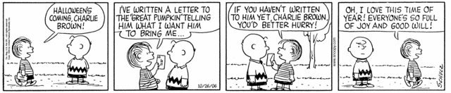 In spite of his insightful nature, he has a naive belief in the Great Pumpkin. So that gave such cute saying about fact.