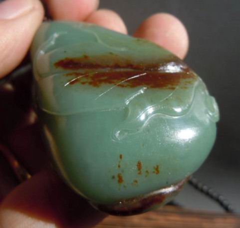 料子很细很细 一口气的 多面带有枣红皮 原籽雕刻 沙枣青料子 泛蓝绿光泽